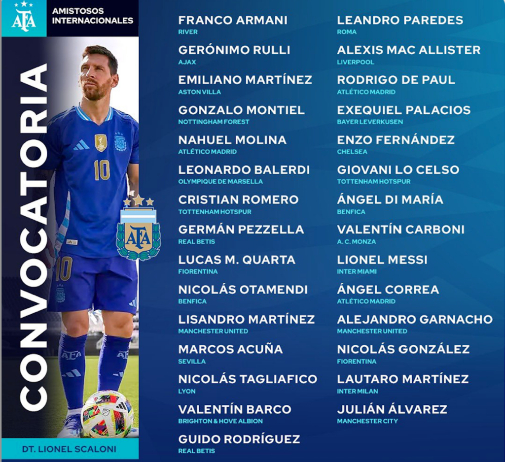La Nazionale Argentina, in vista della Coppa America, ha organizzato due test amichevoli a giugno negli Stati Uniti contro Ecuador e Guatemala. L’Argentina affronterà l’Ecuador al Soldier Field di Chicago il 9 giugno. Cinque giorni dopo, i campioni in carica della Coppa del Mondo giocheranno contro il Guatemala al Commanders Field di Landover, nel Maryland. Quella sara’ l’ultima partita dell’Argentina prima dell’esordio in Coppa America il 20 giugno contro il Canada ad Atlanta. Il Ct Lionel Scaloni ha diramato la lista dei convocati che non comprende il bianconero Nehuen Perez. Sempre presenti, invece, gli ex bianconeri De Paul e Molina.